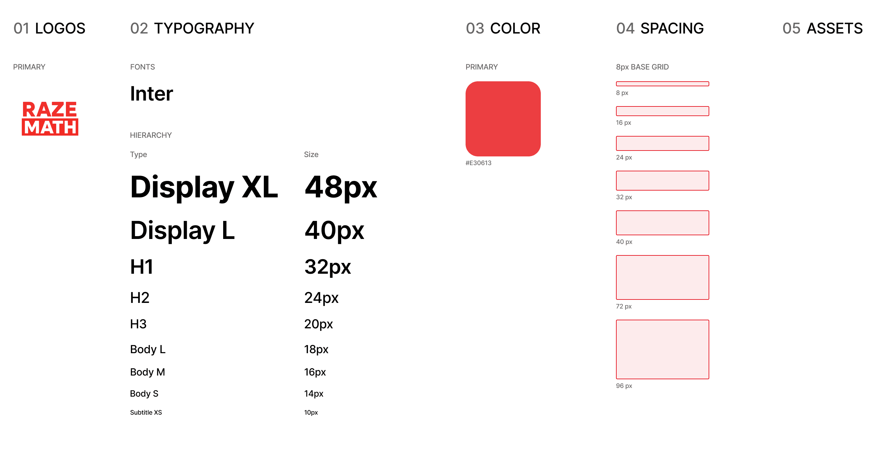 RazeMath's problem of inconsistency was a direct result of lacking a design system that can be used throughout the app. To solve this, I drafted an initial style guide that would keep my iterations consistent.